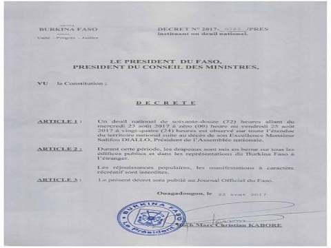 Décès de Salifou Diallo: Le Président du Faso décrète un deuil national de 72h Décès de Salifou Diallo: Le Président du Faso décrète un deuil national de 72h (Visited 1 times, 1 visits today)